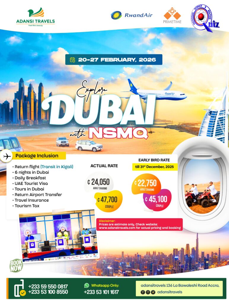 Escape to Dubai this February! Join the NSMQ winners on an unforgettable 7-day journey filled with cultural exploration and exciting tours. Includes return flight (transit in Kigali), Dubai tours with NSMQ winners, travel insurance, tourism tax, and UAE visa! 👉 Secure your spot now by filling out the form — limited spaces available!